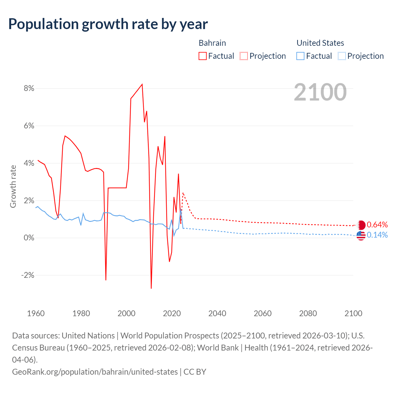 Data sources: World Bank | Health (1960–2024, retrieved 2026-04-06); United Nations | World Population Prospects (1960–2026, retrieved 2026-03-10); U.S. Census Bureau (1960–2025, retrieved 2026-02-08); Central Intelligence Agency (CIA) (2000–2019, retrieved 2026-02-20).