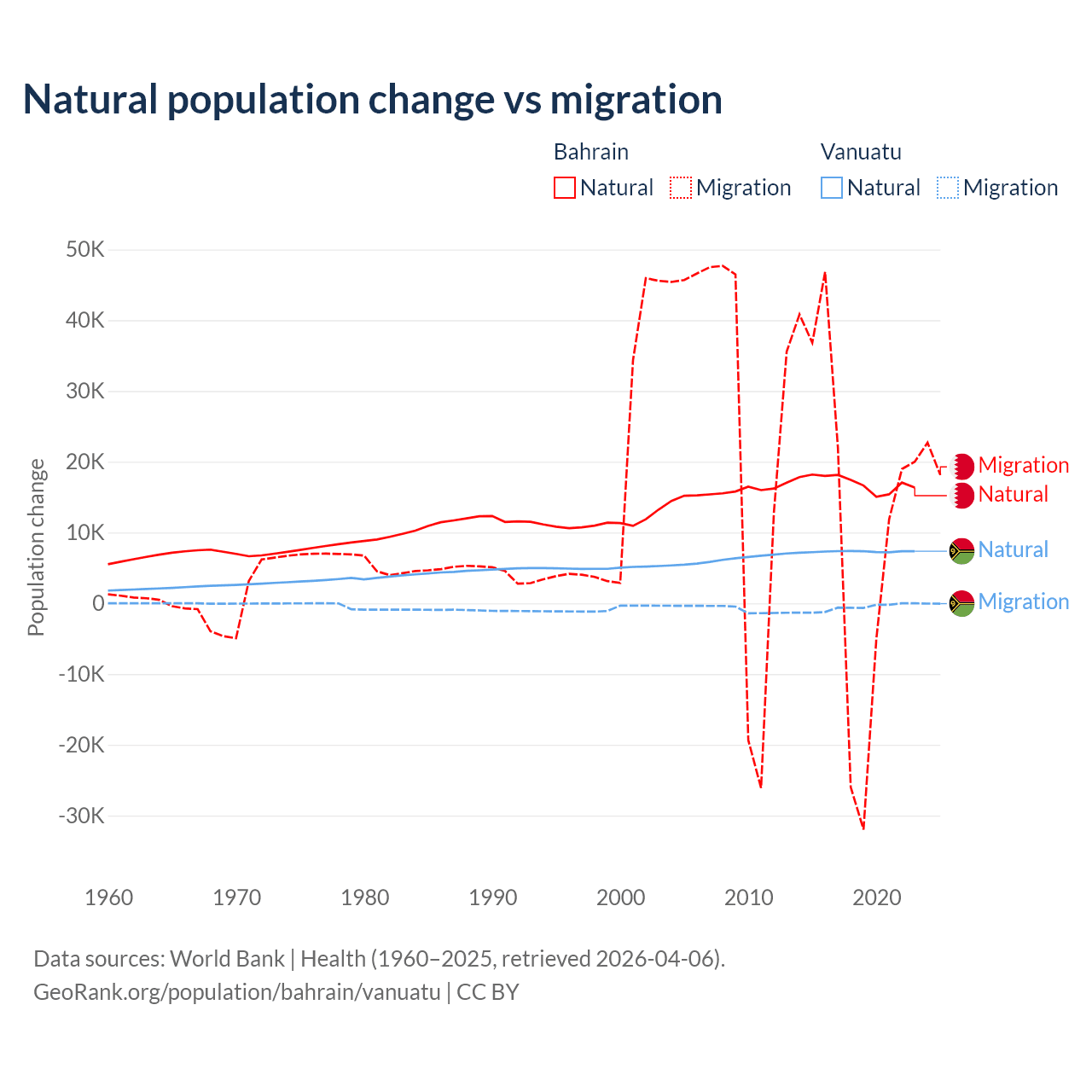 Over the last 10 years, 55.9% of the population change in Bahrain is from natural causes (a gain of 170,110 people) and 44.1% is from migration (a gain of 134,281 people). In Vanuatu 92.2% is from natural causes (a gain of 72,941 people) and 7.81% is from migration (a loss of 6,181 people).
