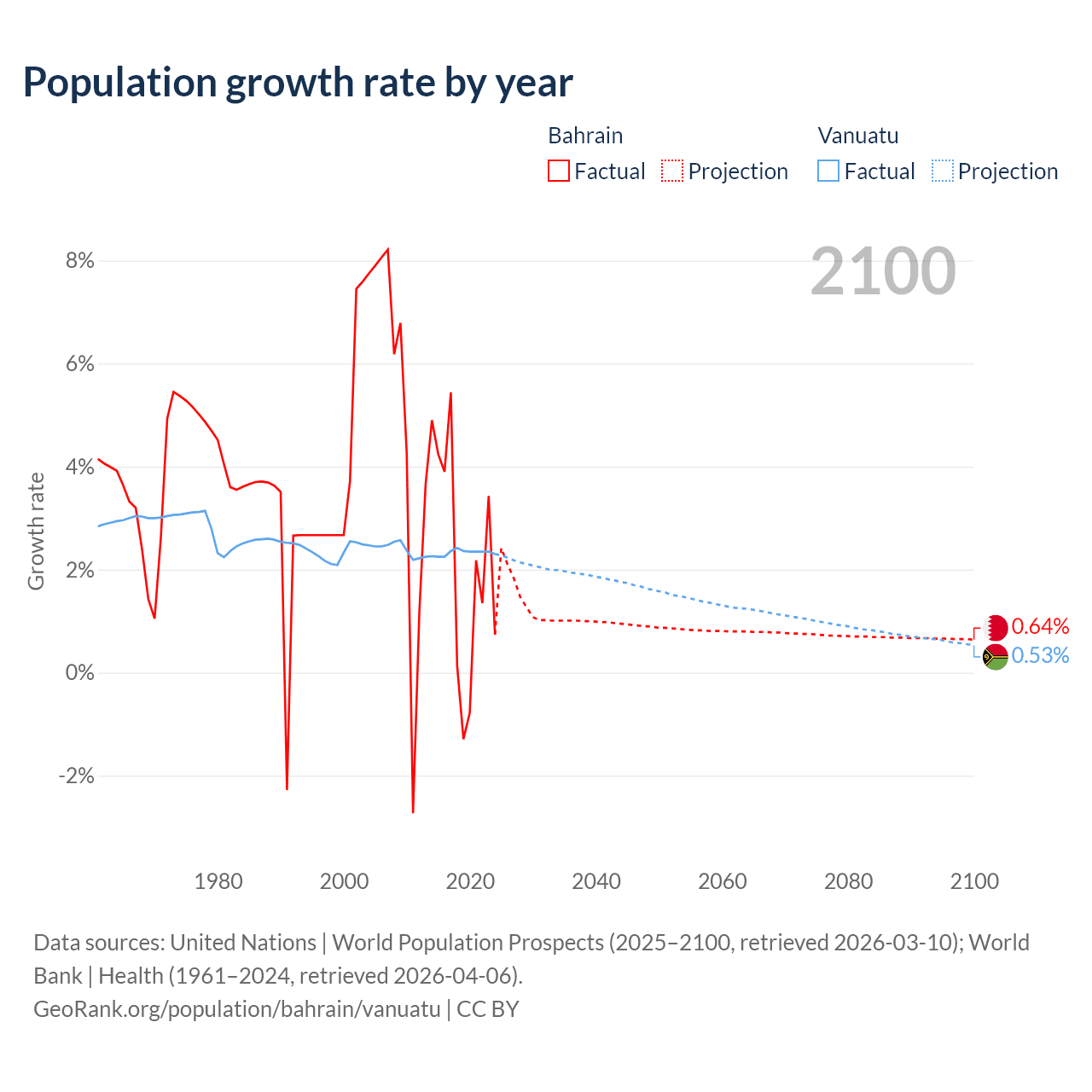 - Since 2006, the population of Bahrain has increased from 960K people to 1.67M (73.8% growth), while Vanuatu has grown from 216K to 345K (59.7% growth).