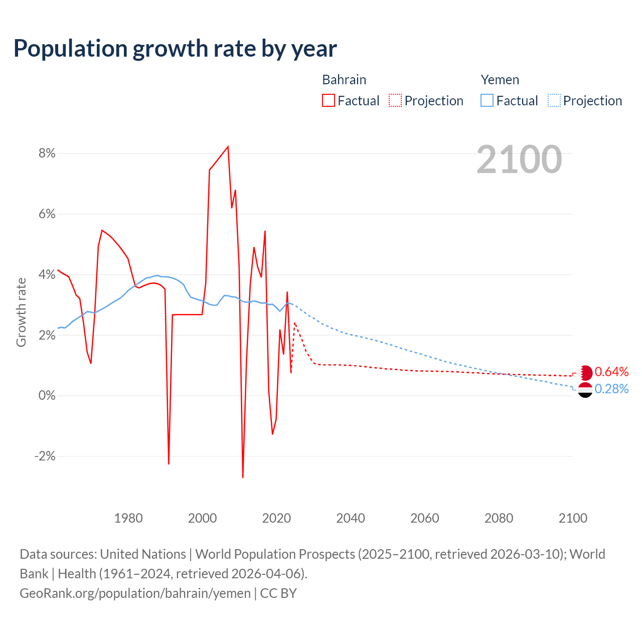 - For the last 10 years, Bahrain has had an average growth rate of +2.2% per year vs +3% in Yemen.