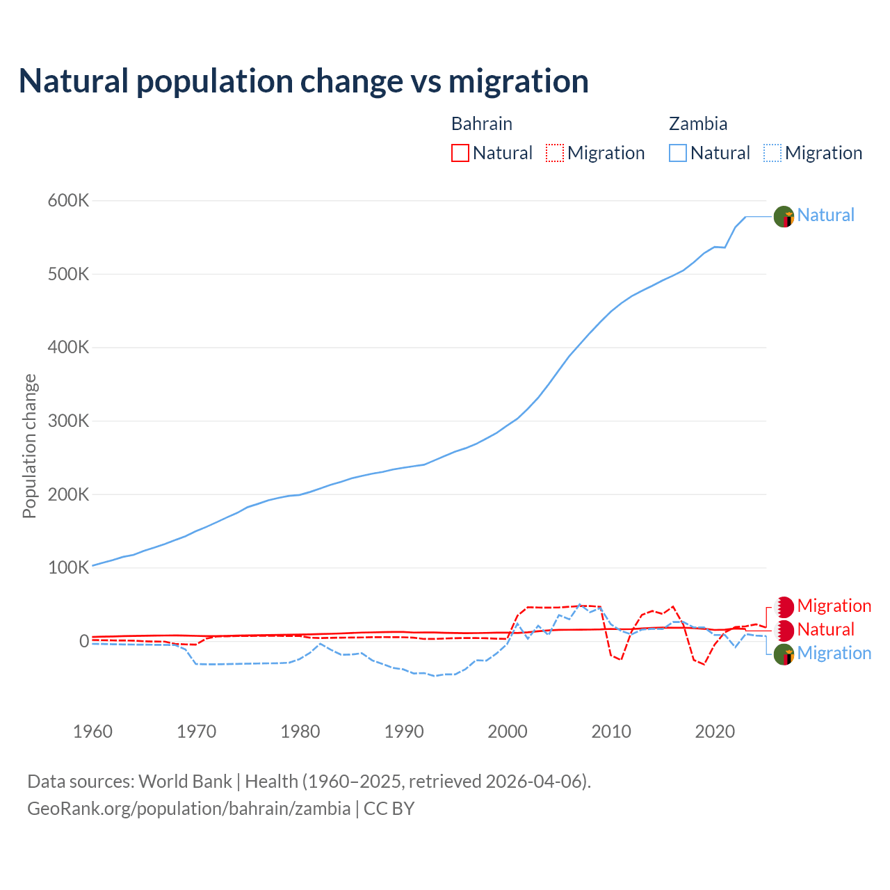 Over the last 10 years, 55.9% of the population change in Bahrain is from natural causes (a gain of 170,110 people) and 44.1% is from migration (a gain of 134,281 people). In Zambia 97.4% is from natural causes (a gain of 5,233,797 people) and 2.58% is from migration (a gain of 138,554 people).
