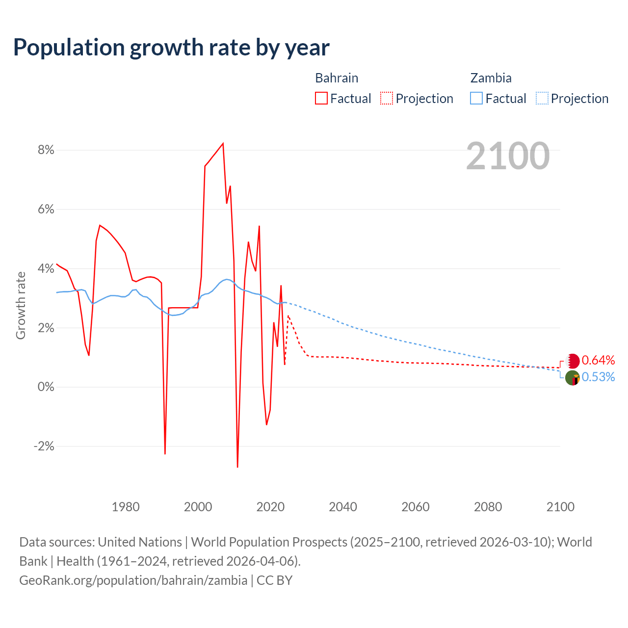 - For the last 10 years, Bahrain has had an average growth rate of +2.2% per year vs +3% in Zambia.