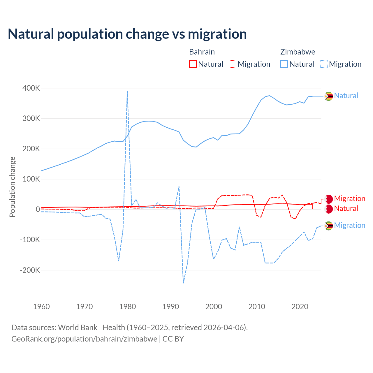 Over the last 10 years, 55.9% of the population change in Bahrain is from natural causes (a gain of 170,110 people) and 44.1% is from migration (a gain of 134,281 people). In Zimbabwe 74.9% is from natural causes (a gain of 3,558,487 people) and 25.1% is from migration (a loss of 1,192,807 people).