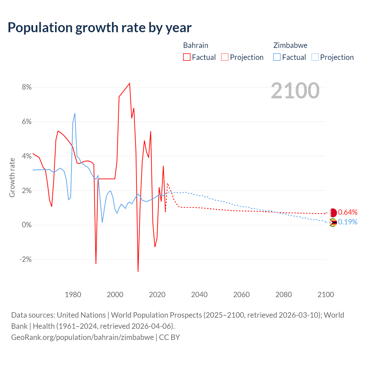 - For the last 10 years, Bahrain has had an average growth rate of +2.2% per year vs +1.57% in Zimbabwe.