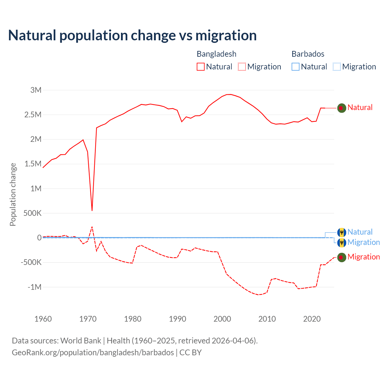 Over the last 10 years, 73.1% of the population change in Bangladesh is from natural causes (a gain of 24,148,039 people) and 26.9% is from migration (a loss of 8,897,408 people). In Barbados 89.5% is from natural causes (a gain of 4,936 people) and 10.5% is from migration (a loss of 578 people).