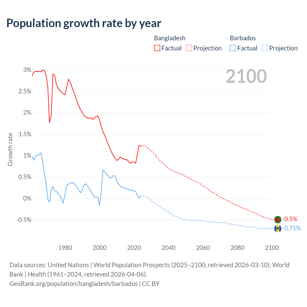 - For the last 10 years, Bangladesh has had an average growth rate of +0.94% per year vs +0.16% in Barbados.