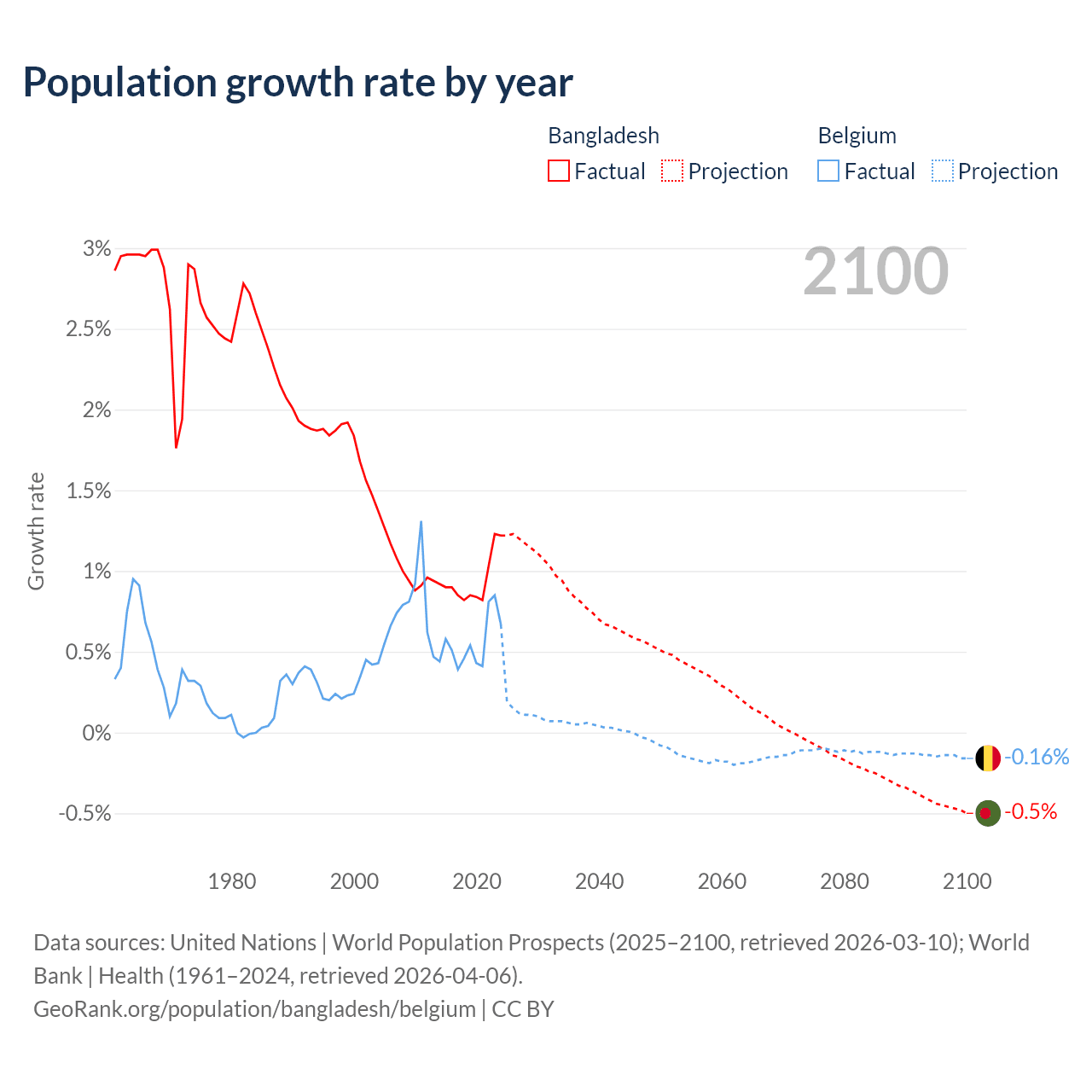 - For the last 10 years, Bangladesh has had an average growth rate of +0.94% per year vs +0.55% in Belgium.
