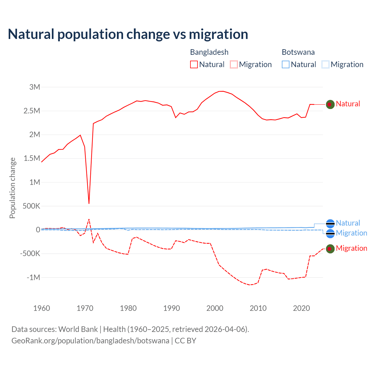 Over the last 10 years, 73.1% of the population change in Bangladesh is from natural causes (a gain of 24,148,039 people) and 26.9% is from migration (a loss of 8,897,408 people). In Botswana 82.5% is from natural causes (a gain of 436,373 people) and 17.5% is from migration (a loss of 92,293 people).