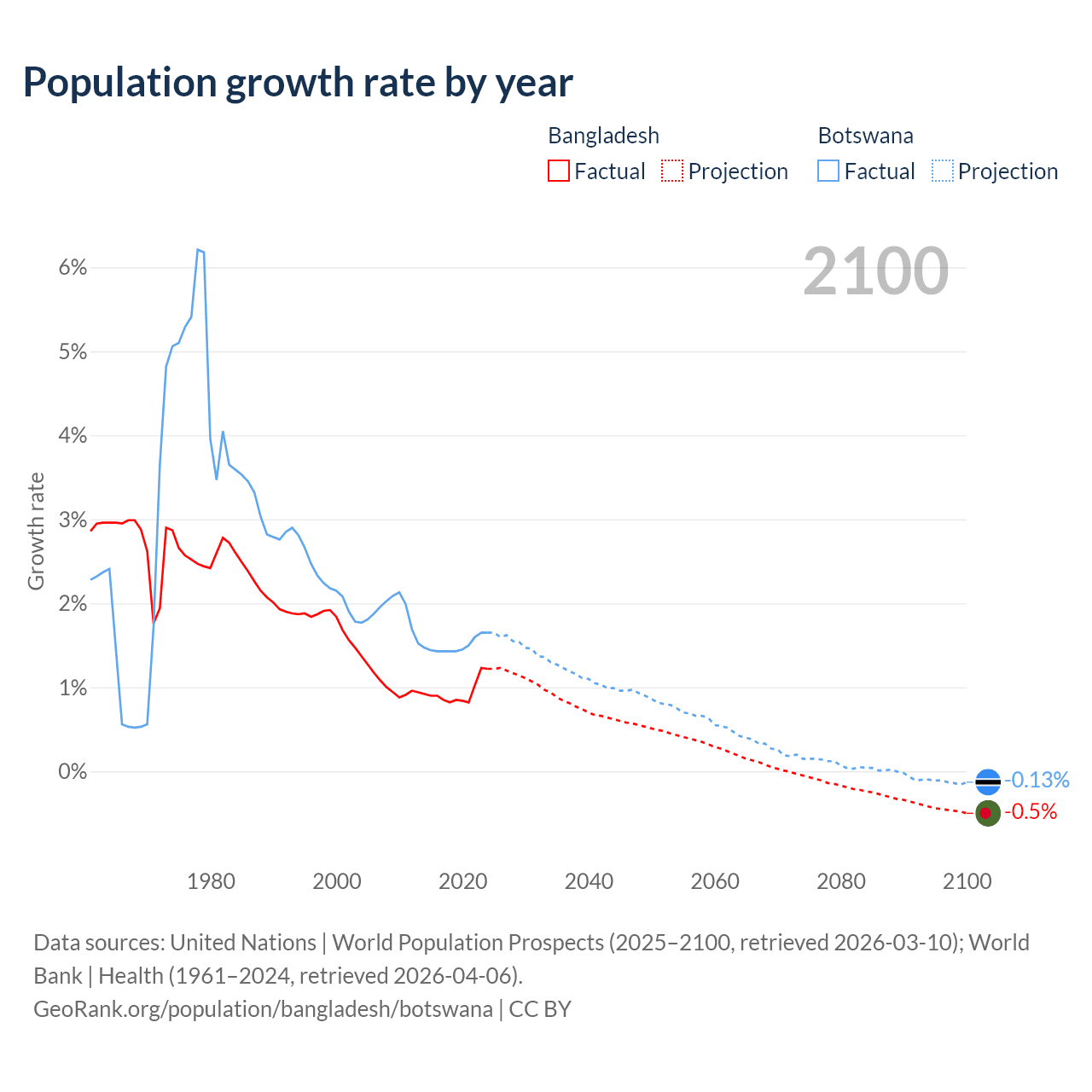 - For the last 10 years, Bangladesh has had an average growth rate of +0.94% per year vs +1.5% in Botswana.