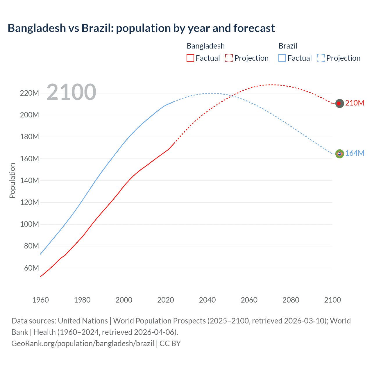 The latest officially reported population of Bangladesh was 173,562,364 in 2024 vs 211,998,573 people in Brazil in 2024. In 2026, based on the adjusted UN estimation, the current Bangladesh's population is 178,415,186 people compared to 213,824,938 in Brazil.