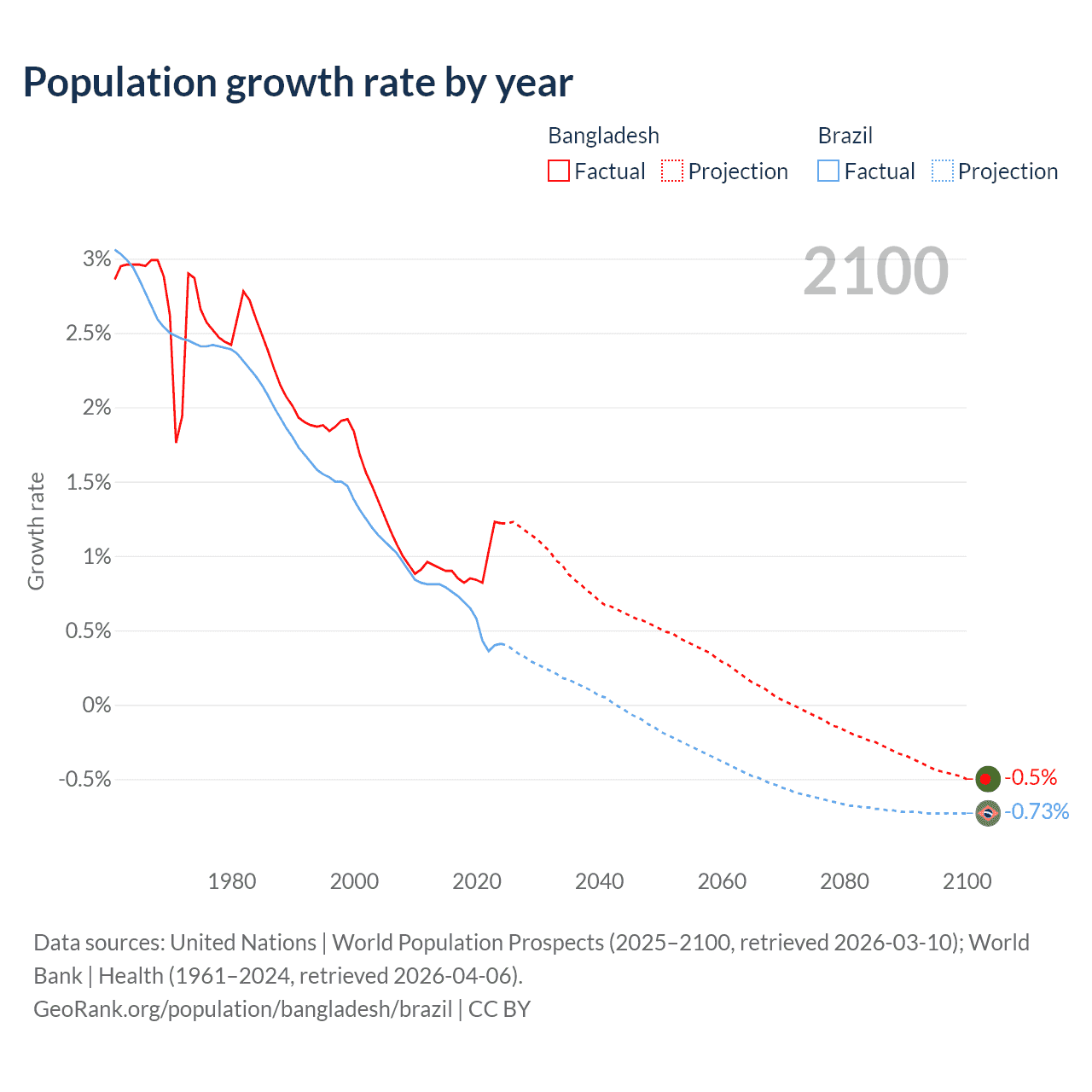 - For the last 10 years, Bangladesh has had an average growth rate of +0.94% per year vs +0.6% in Brazil.