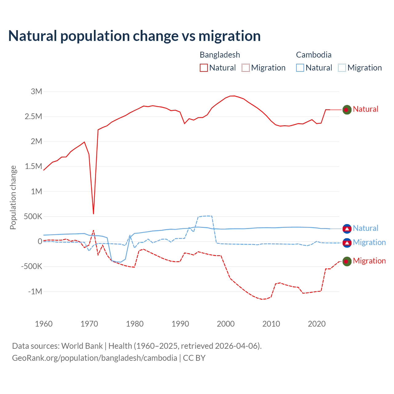 Over the last 10 years, 73.1% of the population change in Bangladesh is from natural causes (a gain of 24,148,039 people) and 26.9% is from migration (a loss of 8,897,408 people). In Cambodia 85.2% is from natural causes (a gain of 2,724,147 people) and 14.8% is from migration (a loss of 474,505 people).
