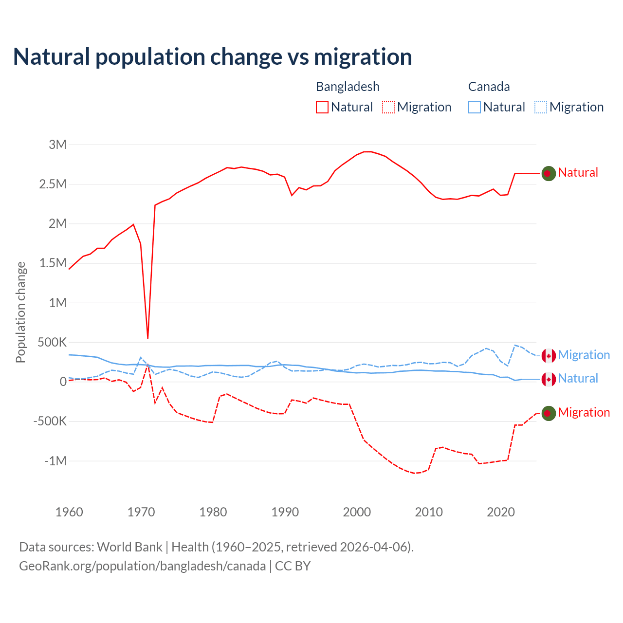 Over the last 10 years, 73.1% of the population change in Bangladesh is from natural causes (a gain of 24,148,039 people) and 26.9% is from migration (a loss of 8,897,408 people). In Canada 19.4% is from natural causes (a gain of 789,345 people) and 80.6% is from migration (a gain of 3,276,554 people).