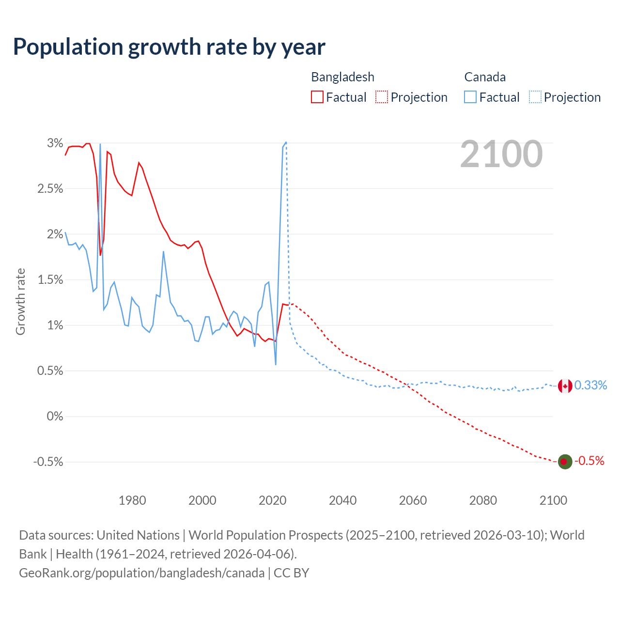 - For the last 10 years, Bangladesh has had an average growth rate of +0.94% per year vs +1.5% in Canada.