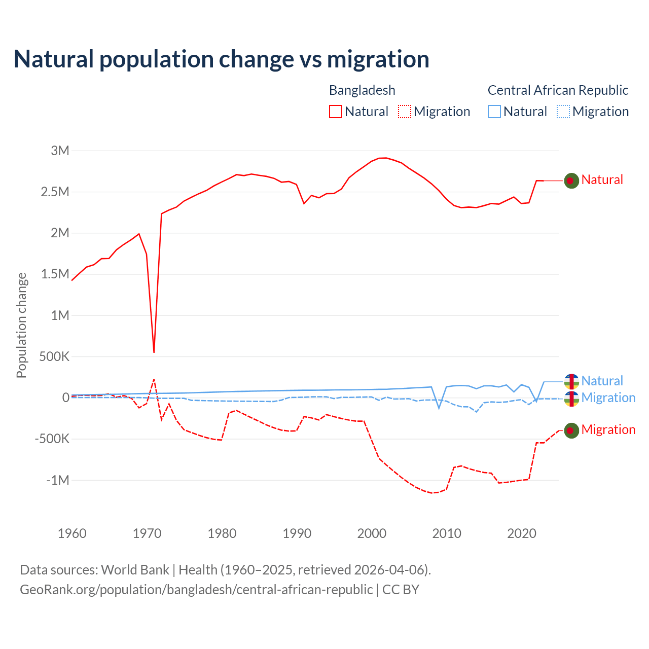 Over the last 10 years, 73.1% of the population change in Bangladesh is from natural causes (a gain of 24,148,039 people) and 26.9% is from migration (a loss of 8,897,408 people). In the Central African Republic 66.7% is from natural causes (a gain of 1,164,312 people) and 33.3% is from migration (a loss of 580,593 people).