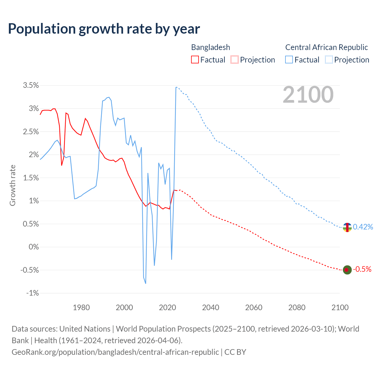 - For the last 10 years, Bangladesh has had an average growth rate of +0.94% per year vs +1.27% in the Central African Republic.