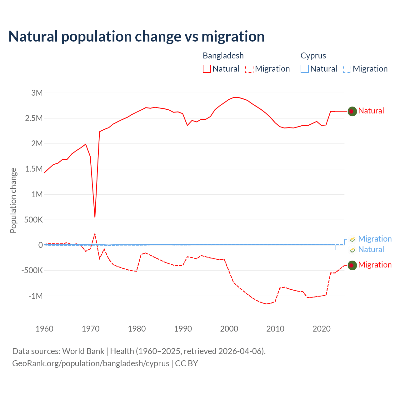 Over the last 10 years, 73.1% of the population change in Bangladesh is from natural causes (a gain of 24,148,039 people) and 26.9% is from migration (a loss of 8,897,408 people). In Cyprus 36.2% is from natural causes (a gain of 57,464 people) and 63.8% is from migration (a gain of 101,458 people).