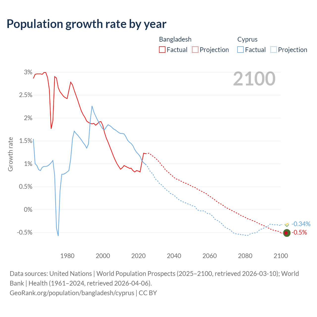 - For the last 10 years, Bangladesh has had an average growth rate of +0.94% per year vs +1.26% in Cyprus.