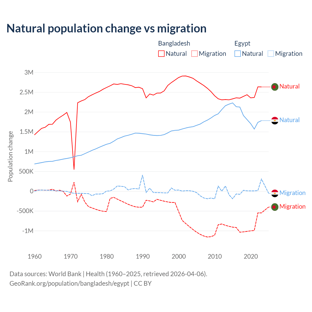 Over the last 10 years, 73.1% of the population change in Bangladesh is from natural causes (a gain of 24,148,039 people) and 26.9% is from migration (a loss of 8,897,408 people). In Egypt 99.6% is from natural causes (a gain of 19,180,073 people) and 0.41% is from migration (a loss of 78,975 people).