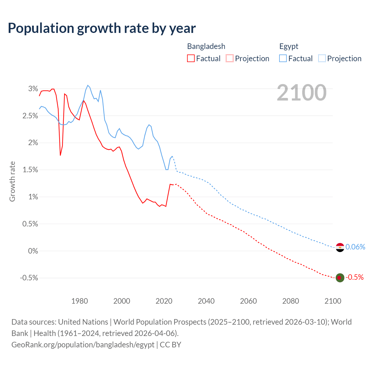 - For the last 10 years, Bangladesh has had an average growth rate of +0.94% per year vs +1.84% in Egypt.