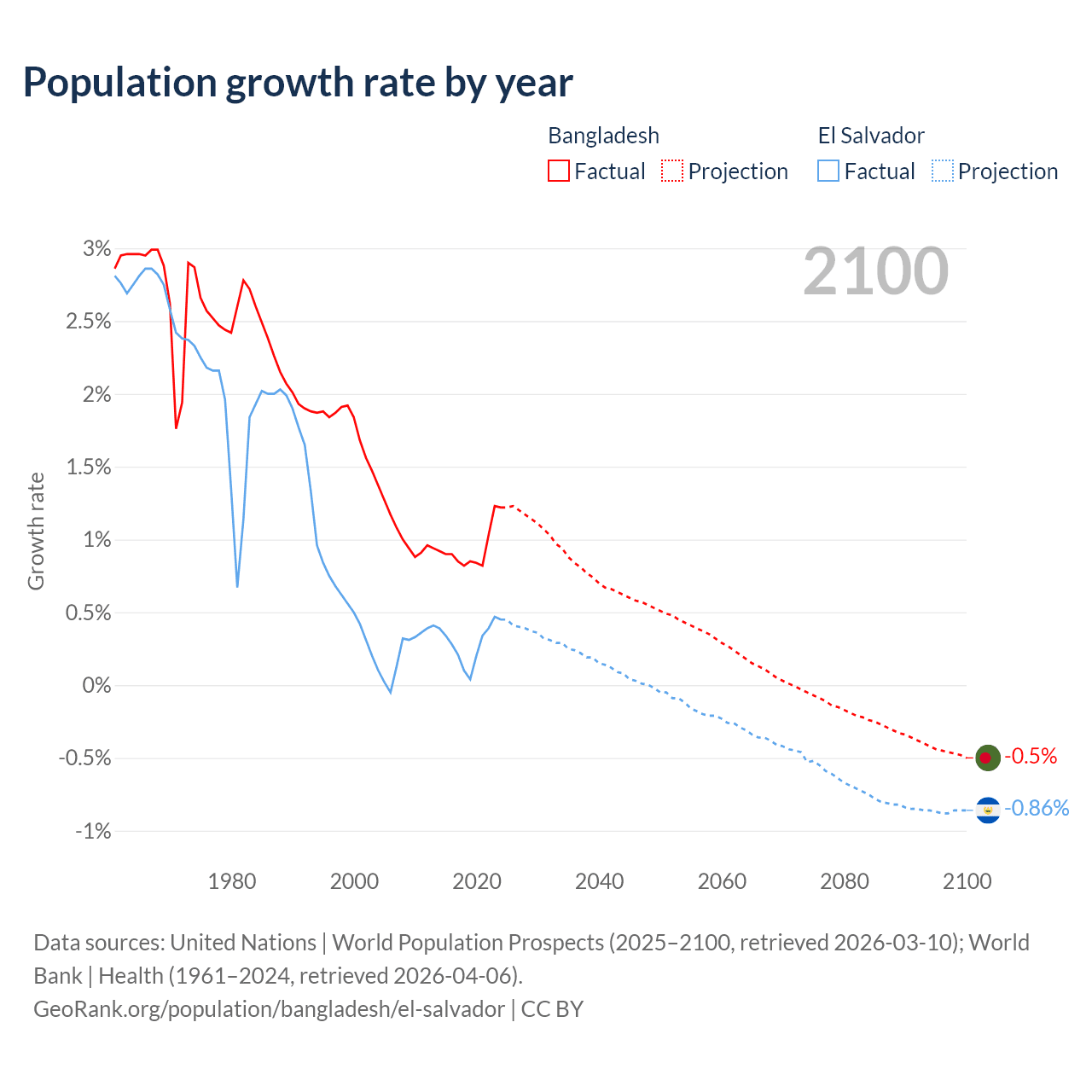 - For the last 10 years, Bangladesh has had an average growth rate of +0.94% per year vs +0.29% in El Salvador.