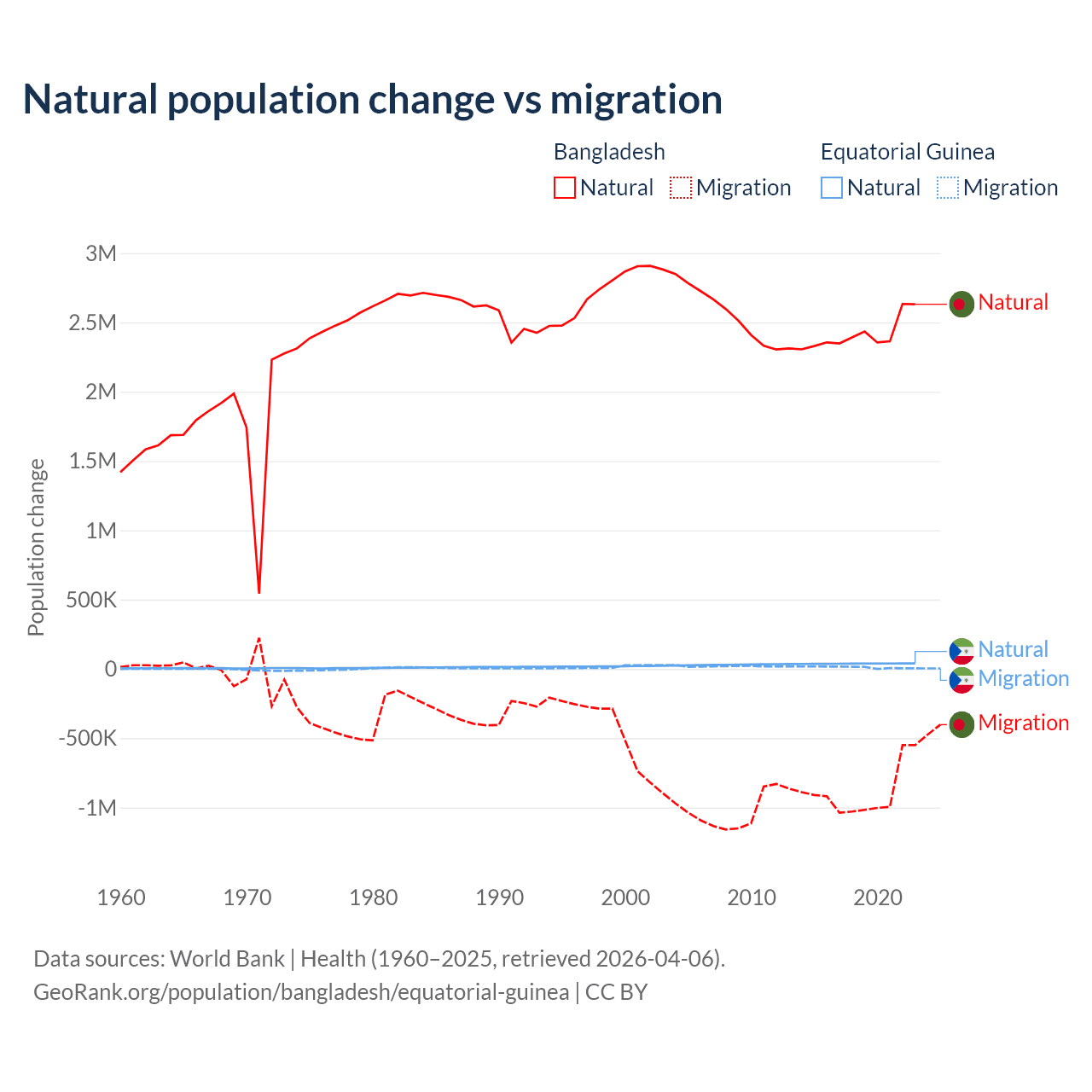 Over the last 10 years, 73.1% of the population change in Bangladesh is from natural causes (a gain of 24,148,039 people) and 26.9% is from migration (a loss of 8,897,408 people). In Equatorial Guinea 77% is from natural causes (a gain of 382,745 people) and 23% is from migration (a gain of 114,024 people).