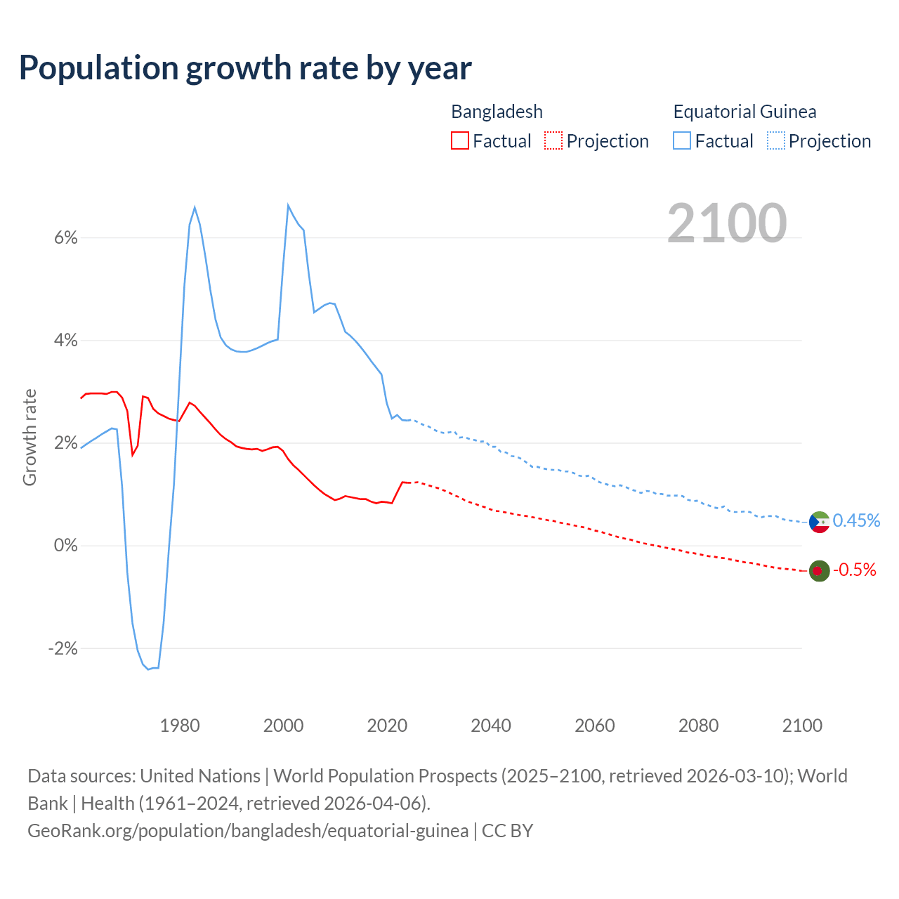 - For the last 10 years, Bangladesh has had an average growth rate of +0.94% per year vs +3.15% in Equatorial Guinea.