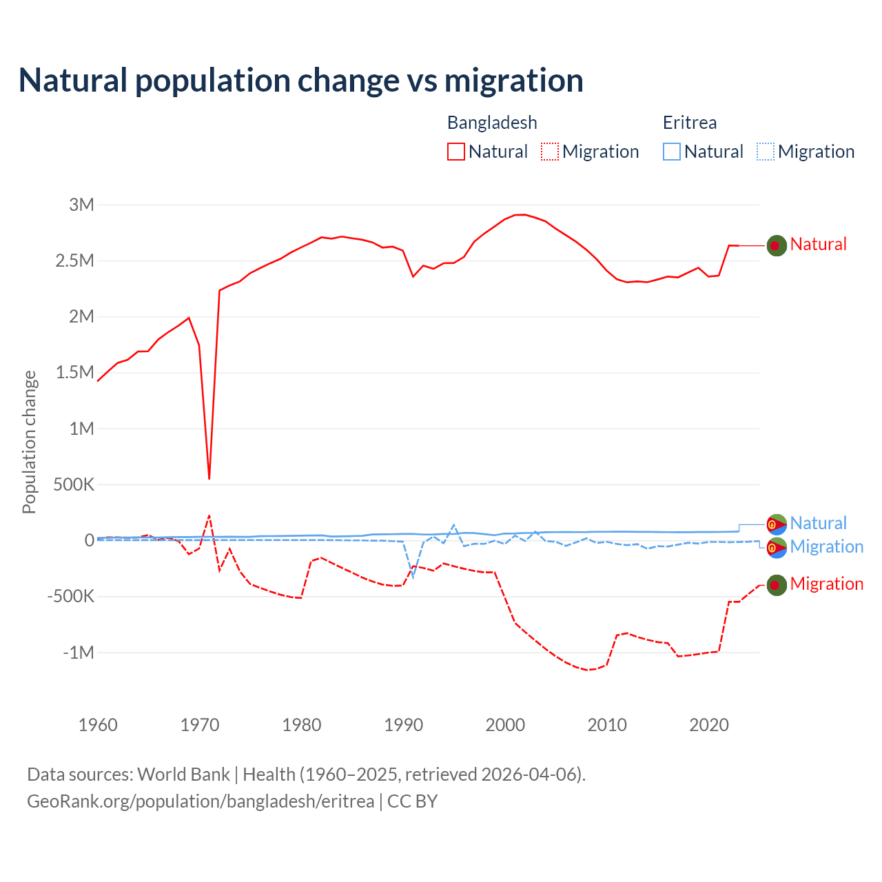 Over the last 10 years, 73.1% of the population change in Bangladesh is from natural causes (a gain of 24,148,039 people) and 26.9% is from migration (a loss of 8,897,408 people). In Eritrea 68.8% is from natural causes (a gain of 742,837 people) and 31.2% is from migration (a loss of 336,243 people).