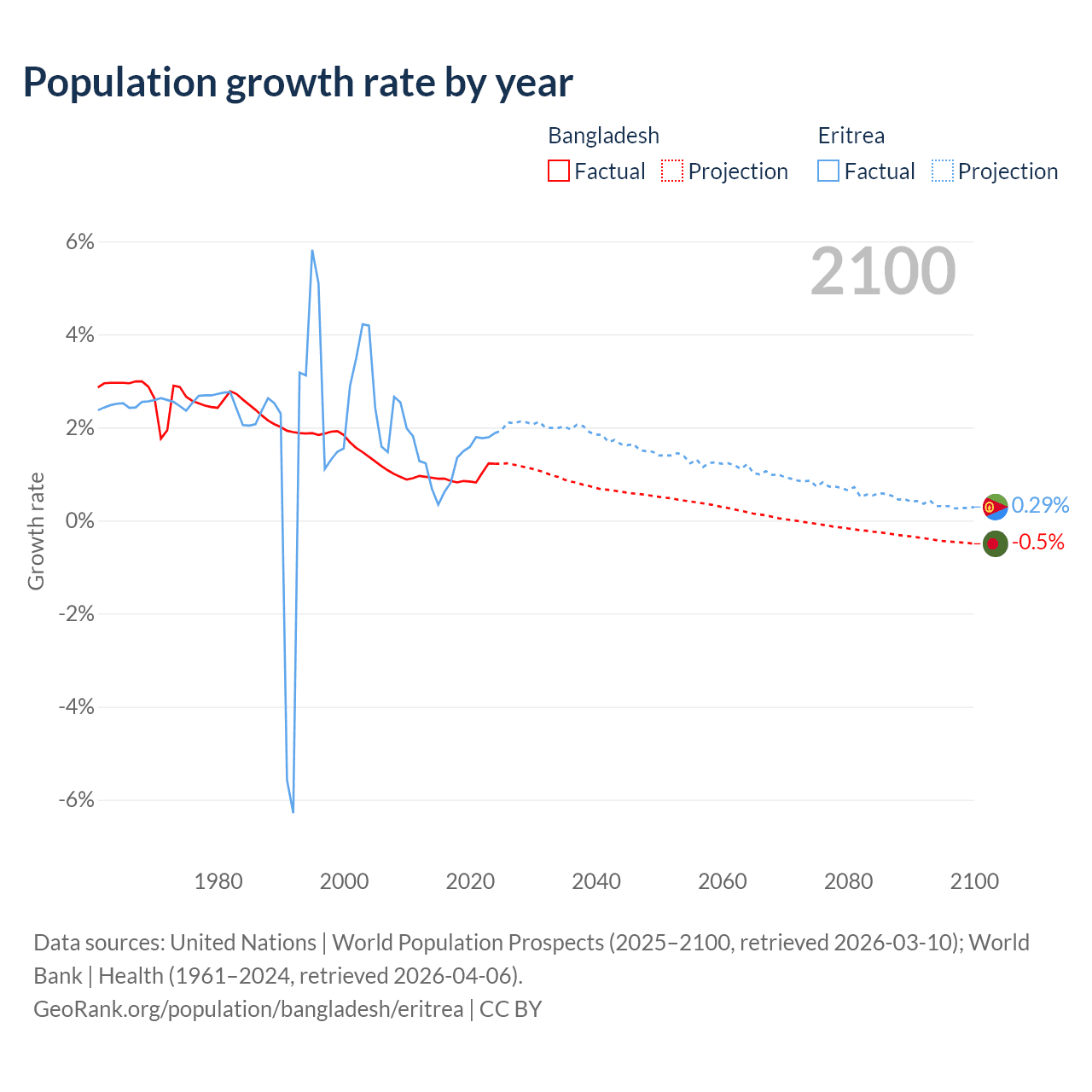 - For the last 10 years, Bangladesh has had an average growth rate of +0.94% per year vs +1.28% in Eritrea.