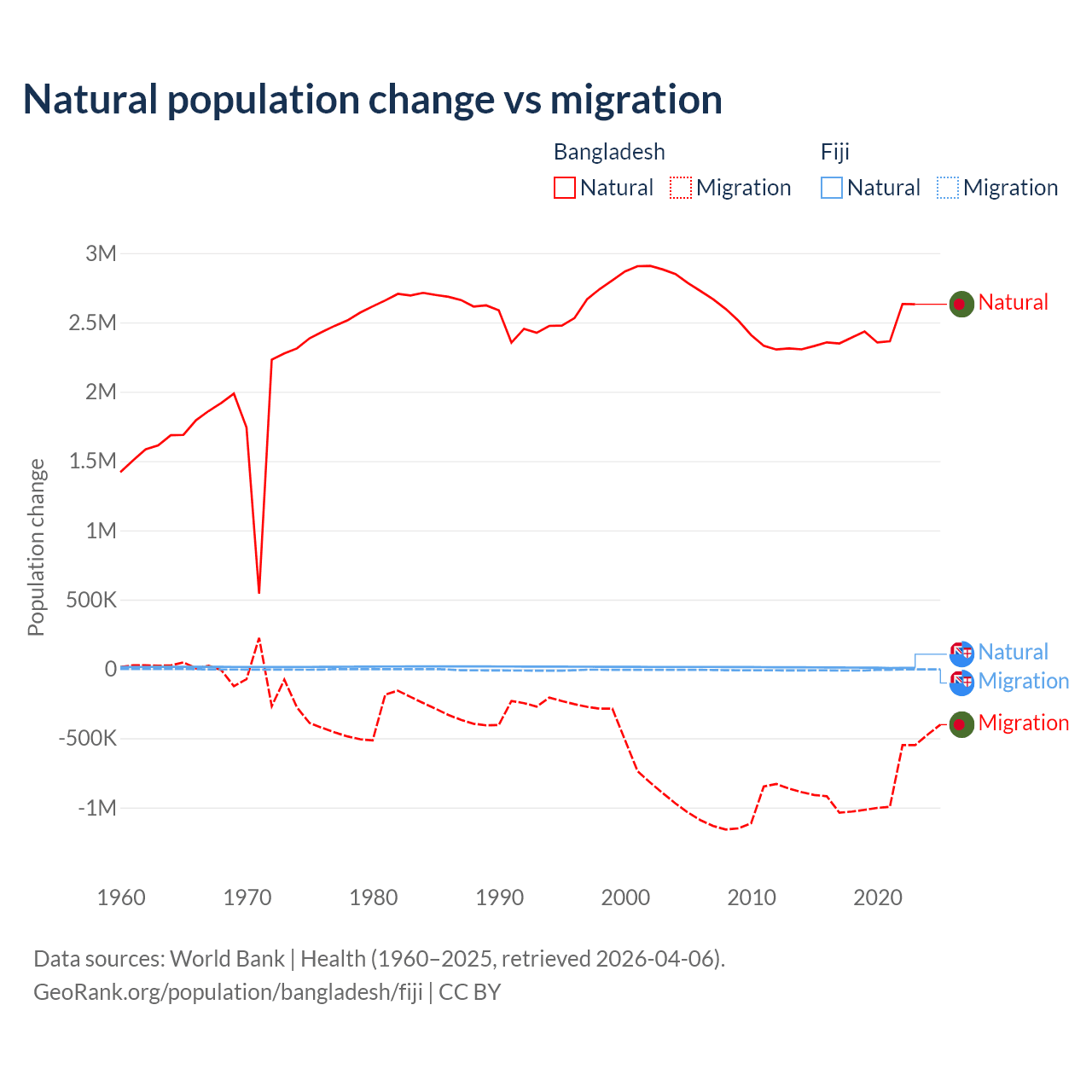 Over the last 10 years, 73.1% of the population change in Bangladesh is from natural causes (a gain of 24,148,039 people) and 26.9% is from migration (a loss of 8,897,408 people). In Fiji 52.6% is from natural causes (a gain of 94,971 people) and 47.4% is from migration (a loss of 85,415 people).