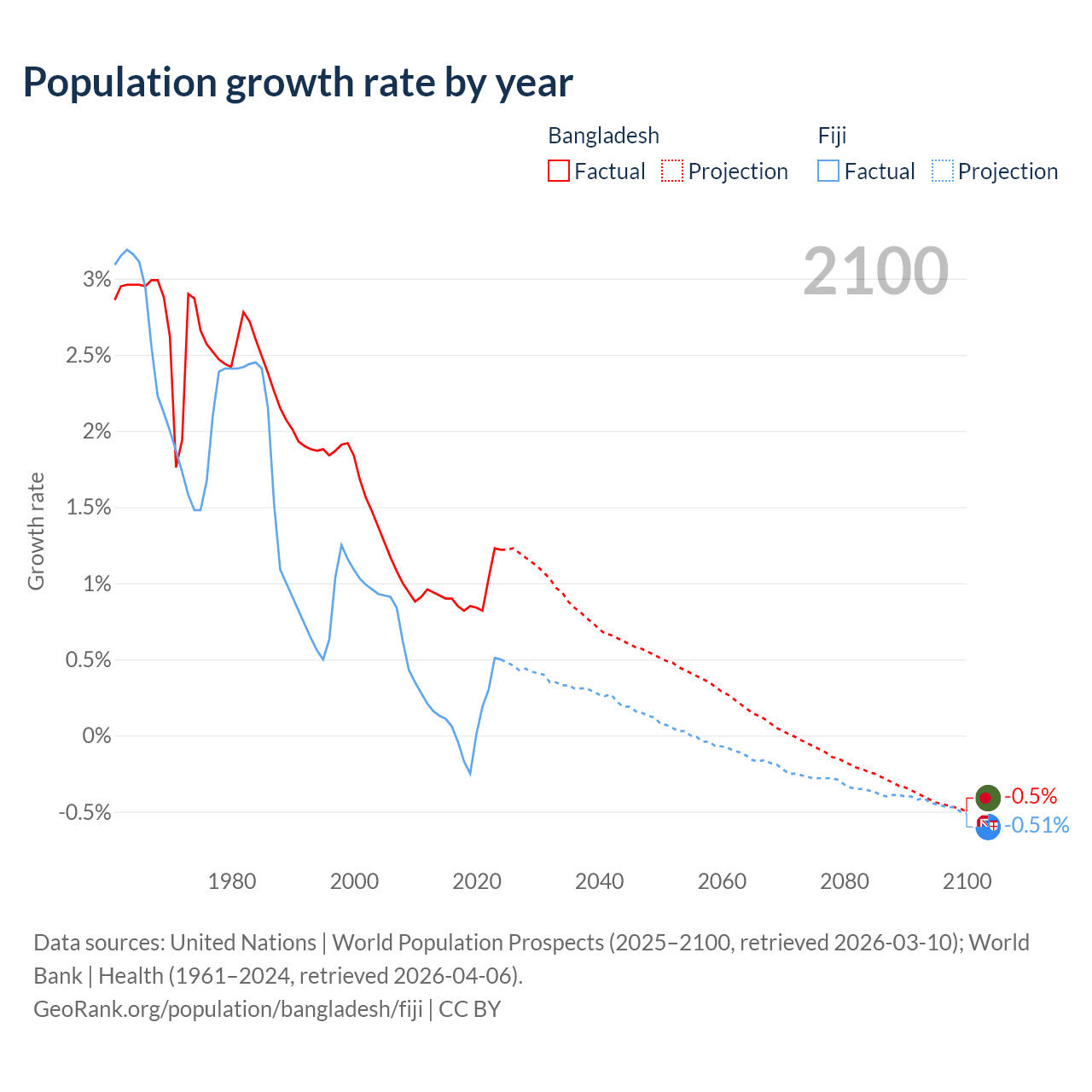 - For the last 10 years, Bangladesh has had an average growth rate of +0.94% per year vs +0.12% in Fiji.