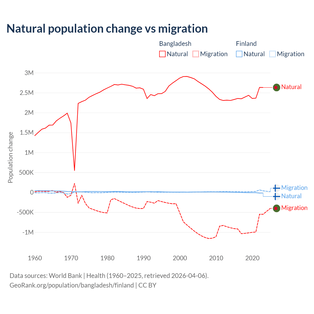 Over the last 10 years, 73.1% of the population change in Bangladesh is from natural causes (a gain of 24,148,039 people) and 26.9% is from migration (a loss of 8,897,408 people). In Finland 22.5% is from natural causes (a loss of 65,560 people) and 77.5% is from migration (a gain of 225,237 people).
