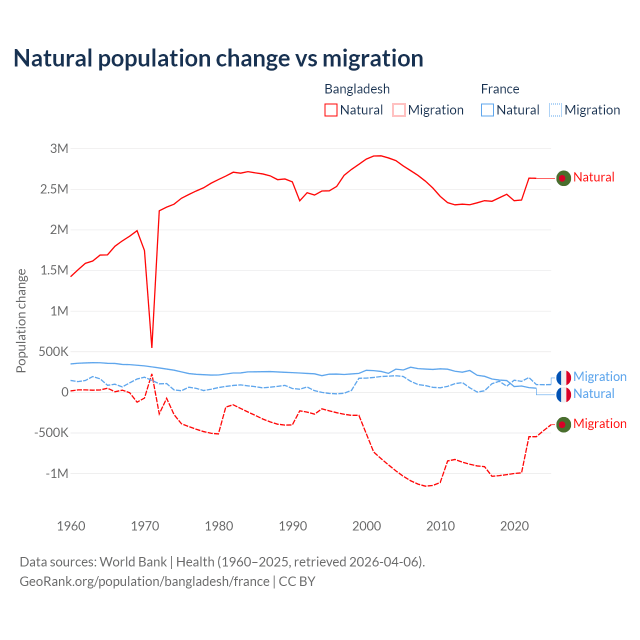 Over the last 10 years, 73.1% of the population change in Bangladesh is from natural causes (a gain of 24,148,039 people) and 26.9% is from migration (a loss of 8,897,408 people). In France 59.5% is from natural causes (a gain of 1,359,540 people) and 40.5% is from migration (a gain of 923,723 people).