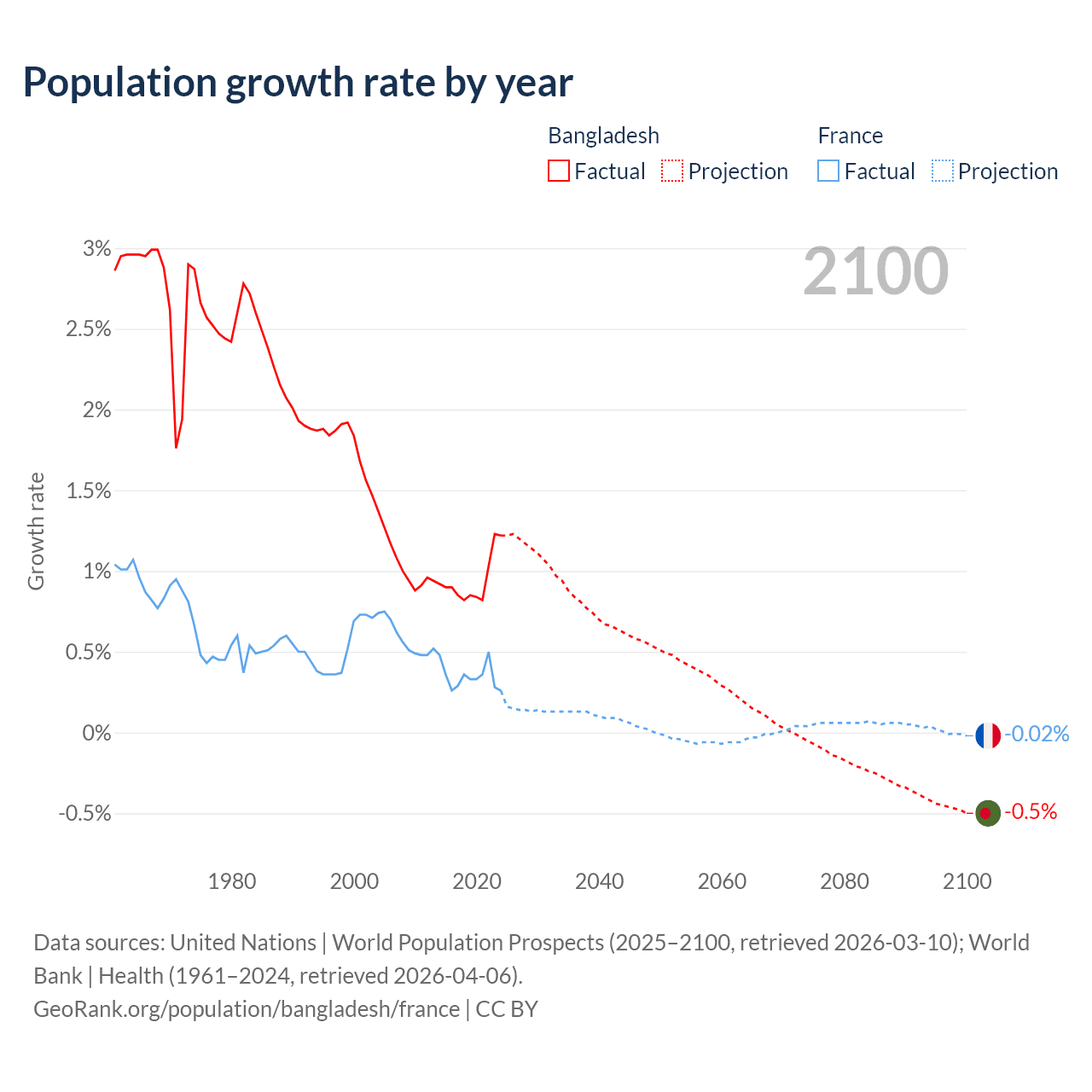 - For the last 10 years, Bangladesh has had an average growth rate of +0.94% per year vs +0.35% in France.