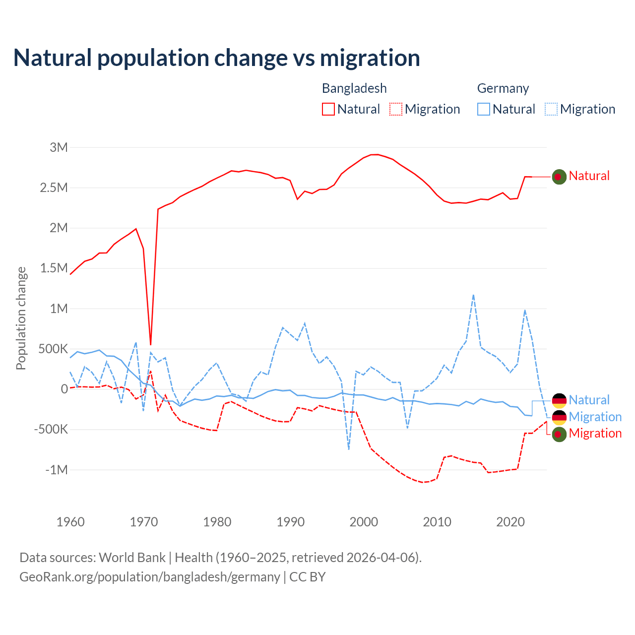 Over the last 10 years, 73.1% of the population change in Bangladesh is from natural causes (a gain of 24,148,039 people) and 26.9% is from migration (a loss of 8,897,408 people). In Germany 26.8% is from natural causes (a loss of 2,036,130 people) and 73.2% is from migration (a gain of 5,565,916 people).