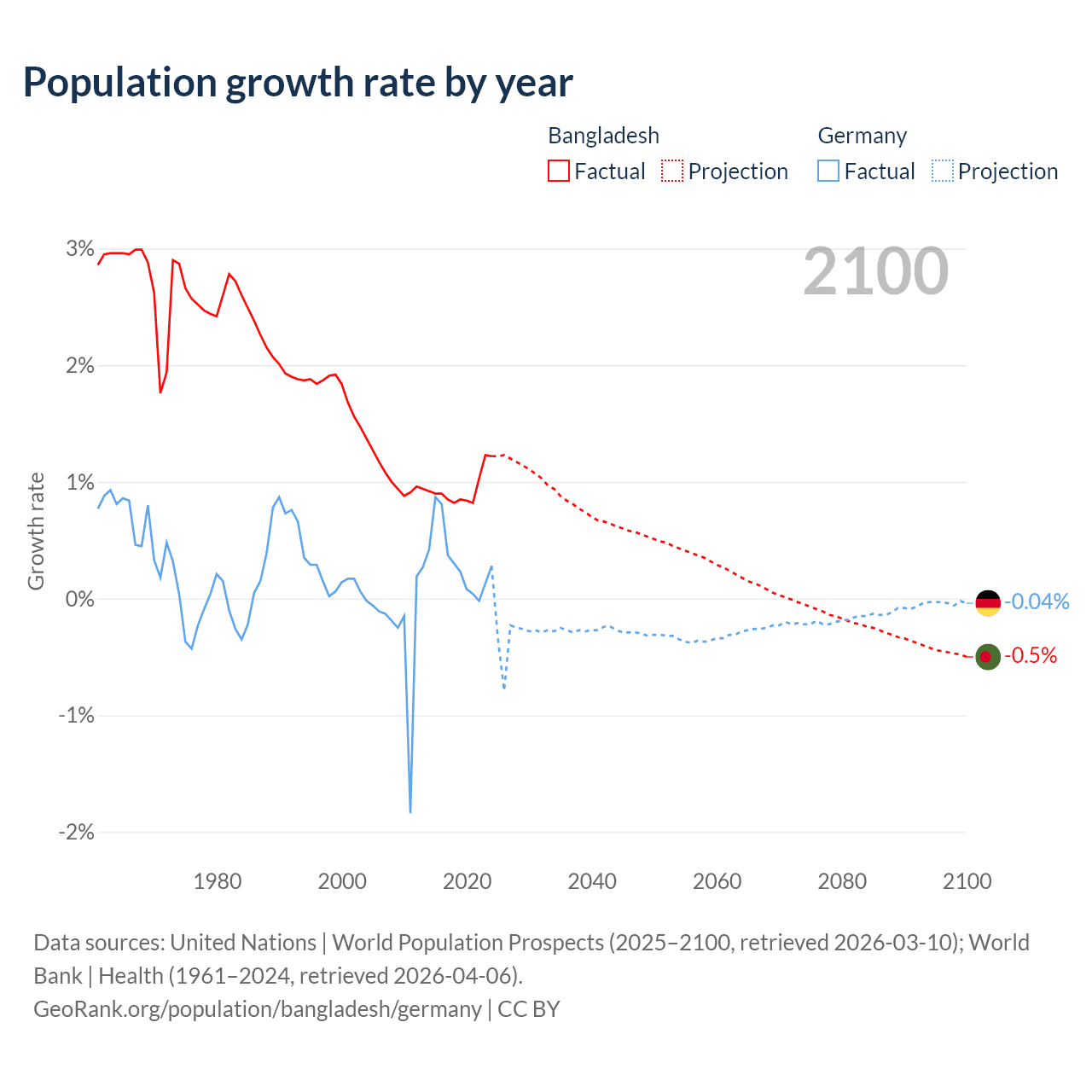 - For the last 10 years, Bangladesh has had an average growth rate of +0.94% per year vs +0.32% in Germany.