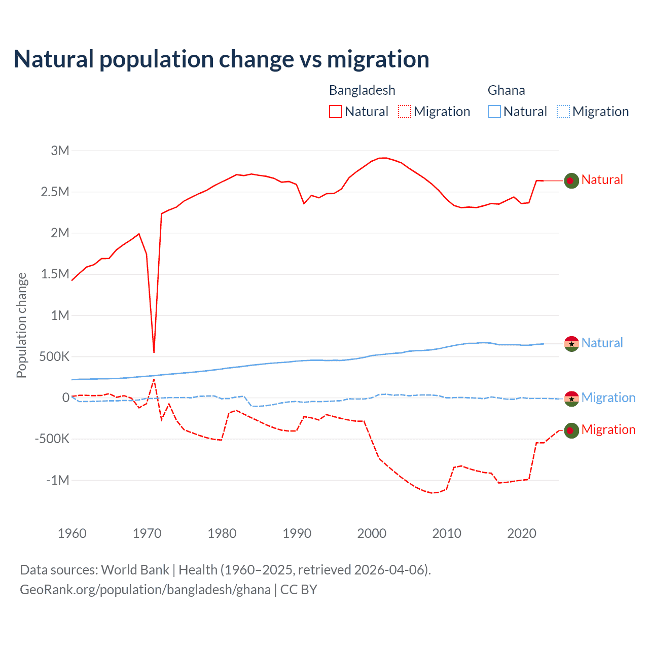 Over the last 10 years, 73.1% of the population change in Bangladesh is from natural causes (a gain of 24,148,039 people) and 26.9% is from migration (a loss of 8,897,408 people). In Ghana 98.6% is from natural causes (a gain of 6,484,449 people) and 1.37% is from migration (a loss of 90,310 people).