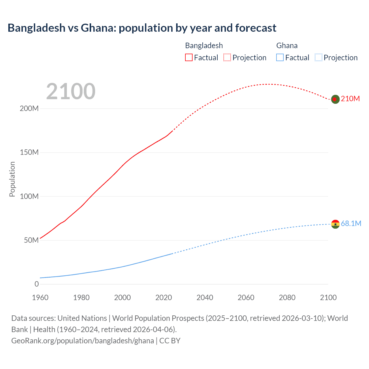 Bangladesh vs Ghana: population by year and forecast