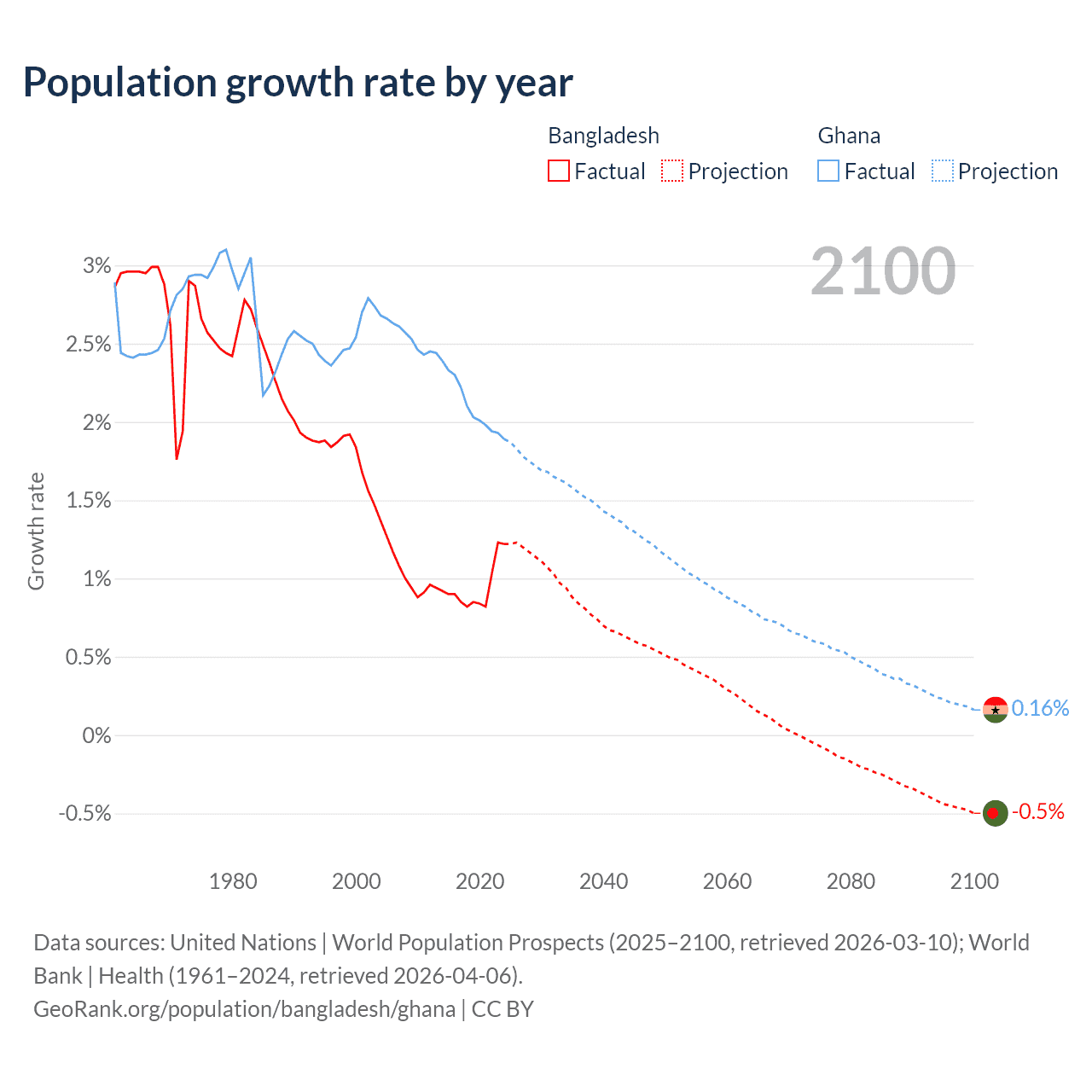 - For the last 10 years, Bangladesh has had an average growth rate of +0.94% per year vs +2.1% in Ghana.