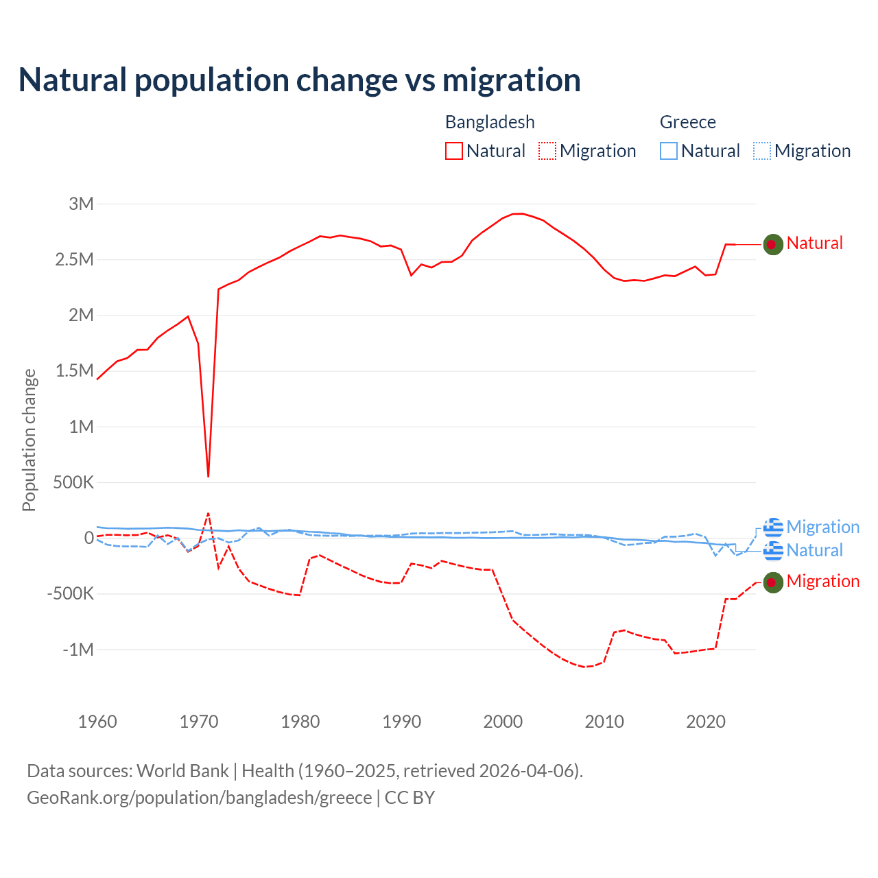 Over the last 10 years, 73.1% of the population change in Bangladesh is from natural causes (a gain of 24,148,039 people) and 26.9% is from migration (a loss of 8,897,408 people). In Greece 51.9% is from natural causes (a loss of 411,426 people) and 48.1% is from migration (a loss of 381,824 people).