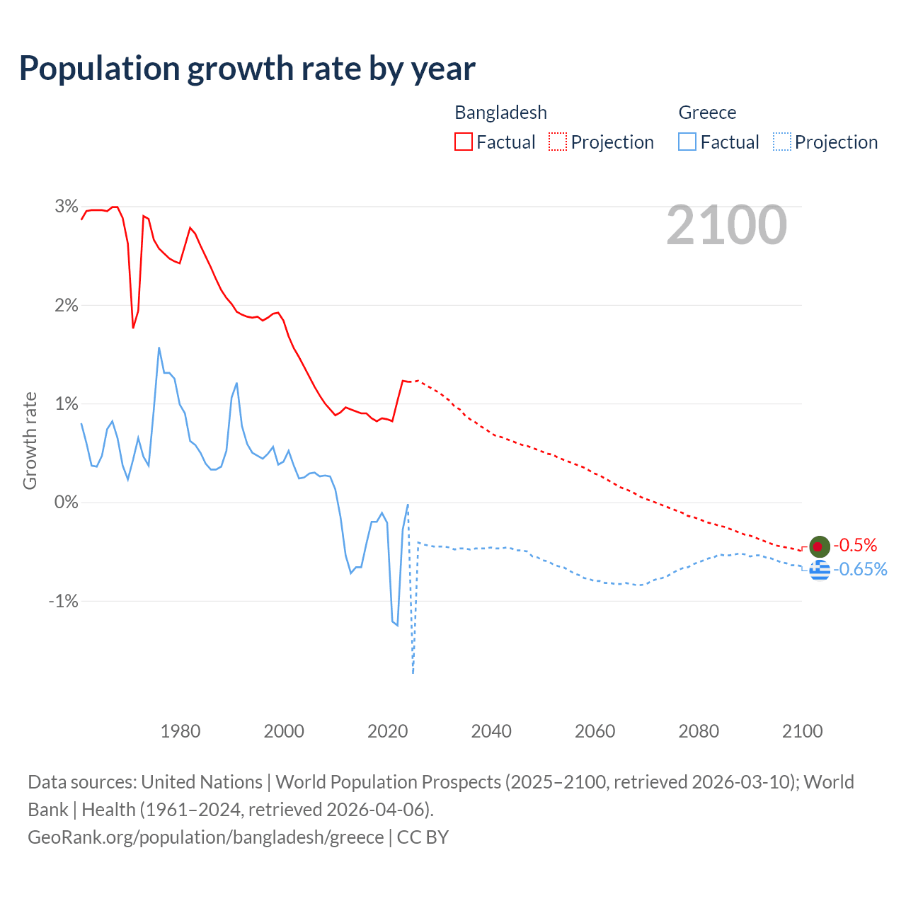 - For the last 10 years, Bangladesh has had an average growth rate of +0.94% per year vs -0.47% in Greece.