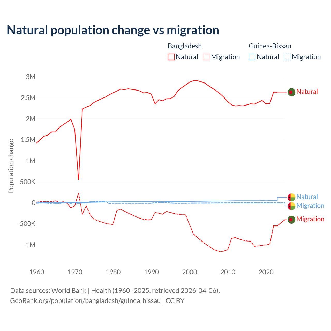 Over the last 10 years, 73.1% of the population change in Bangladesh is from natural causes (a gain of 24,148,039 people) and 26.9% is from migration (a loss of 8,897,408 people). In Guinea-Bissau 97.1% is from natural causes (a gain of 472,826 people) and 2.87% is from migration (a loss of 13,956 people).