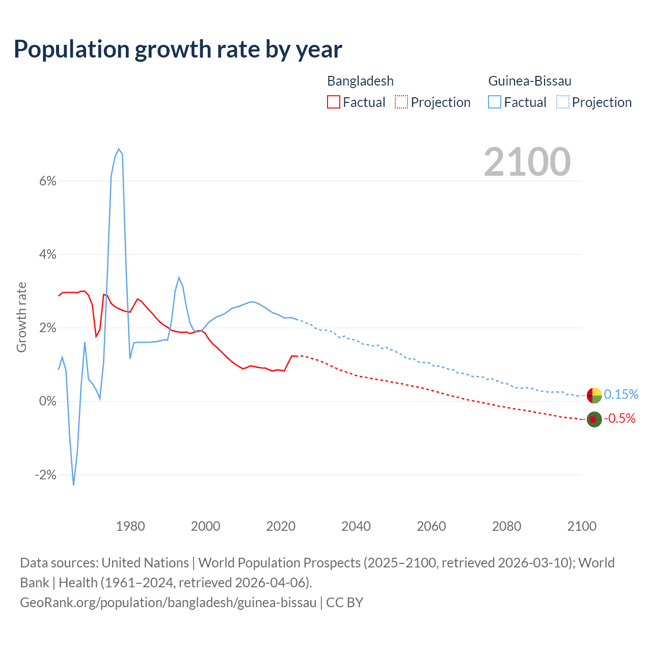 - For the last 10 years, Bangladesh has had an average growth rate of +0.94% per year vs +2.4% in Guinea-Bissau.