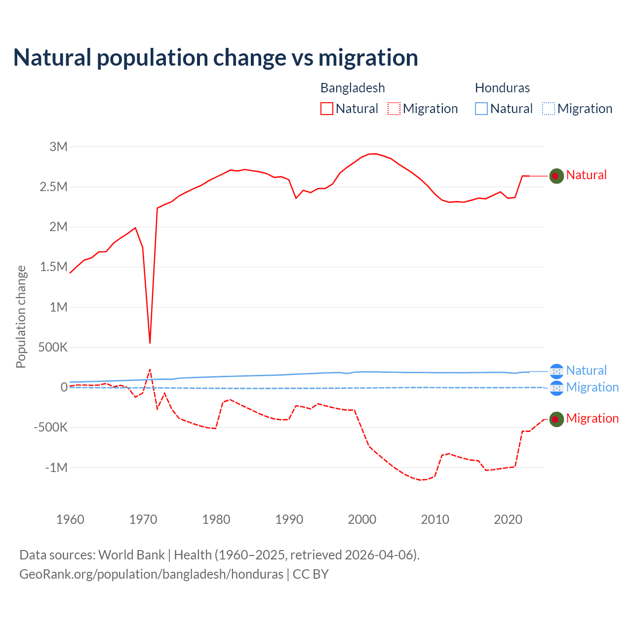 Over the last 10 years, 73.1% of the population change in Bangladesh is from natural causes (a gain of 24,148,039 people) and 26.9% is from migration (a loss of 8,897,408 people). In Honduras 96.7% is from natural causes (a gain of 1,821,125 people) and 3.29% is from migration (a loss of 61,965 people).