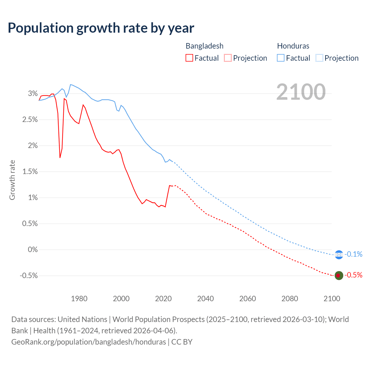 - For the last 10 years, Bangladesh has had an average growth rate of +0.94% per year vs +1.81% in Honduras.
