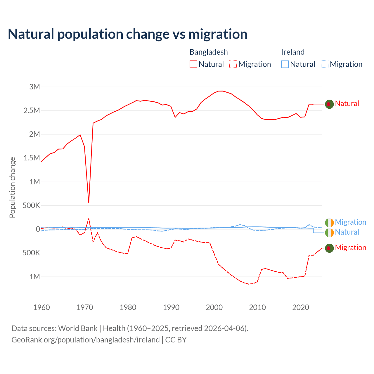 Over the last 10 years, 73.1% of the population change in Bangladesh is from natural causes (a gain of 24,148,039 people) and 26.9% is from migration (a loss of 8,897,408 people). In Ireland 48.2% is from natural causes (a gain of 284,644 people) and 51.8% is from migration (a gain of 305,297 people).