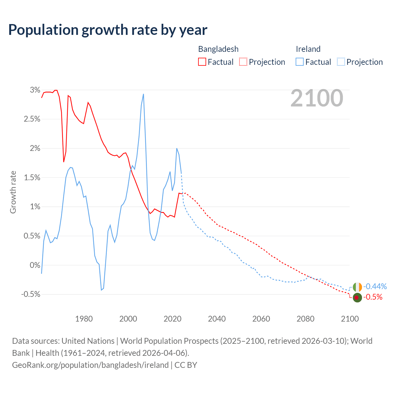 - For the last 10 years, Bangladesh has had an average growth rate of +0.94% per year vs +1.41% in Ireland.