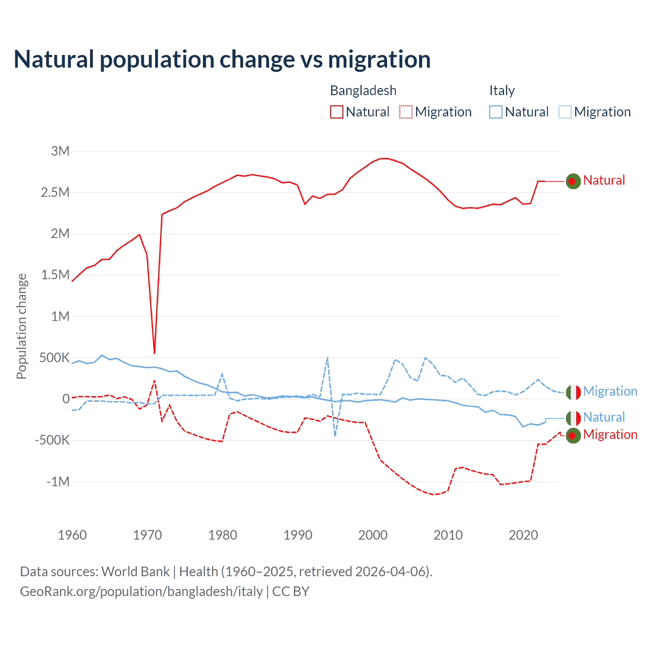Over the last 10 years, 73.1% of the population change in Bangladesh is from natural causes (a gain of 24,148,039 people) and 26.9% is from migration (a loss of 8,897,408 people). In Italy 68.6% is from natural causes (a loss of 2,239,084 people) and 31.4% is from migration (a gain of 1,026,128 people).