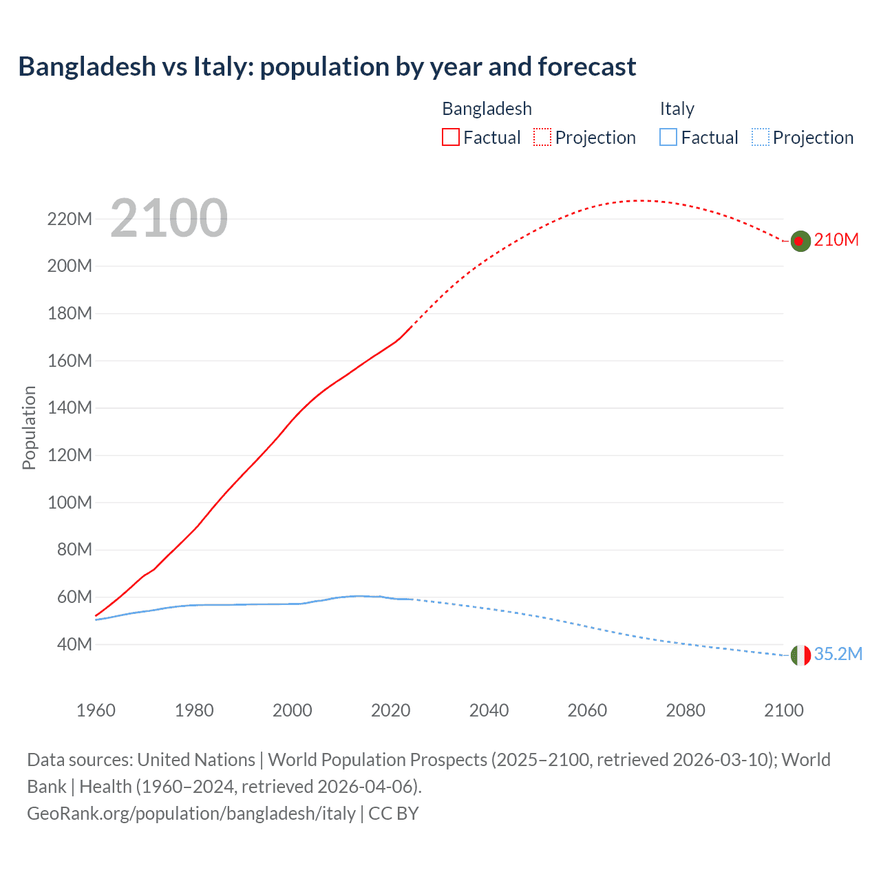 The latest officially reported population of Bangladesh was 173,562,364 in 2024 vs 58,952,704 people in Italy in 2024. In 2026, based on the adjusted UN estimation, the current Bangladesh's population is 178,415,186 people compared to 58,562,681 in Italy.