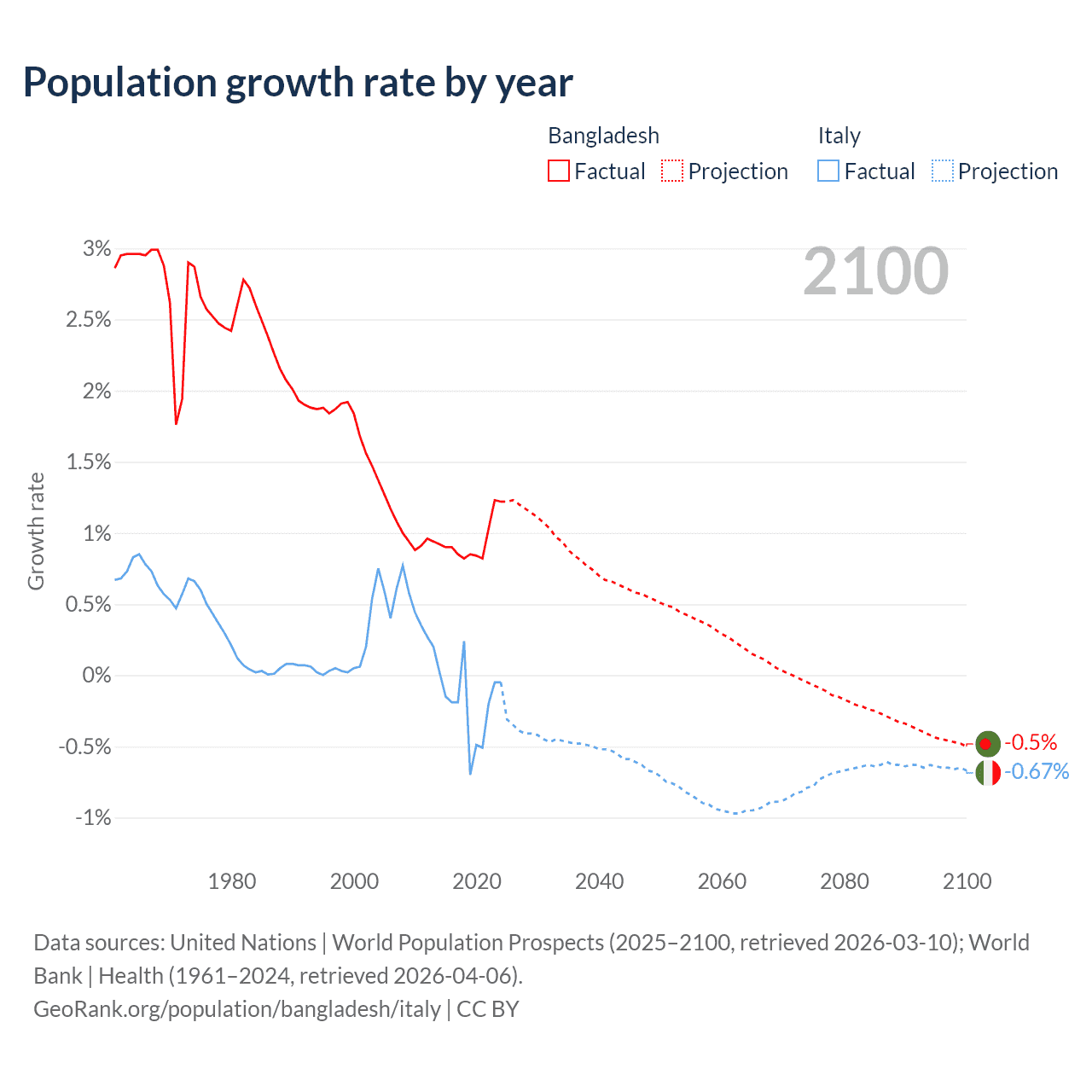- For the last 10 years, Bangladesh has had an average growth rate of +0.94% per year vs -0.21% in Italy.